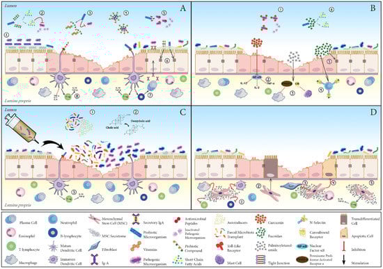 Schematic representation of the potential mechanisms underpinning beneficial effects of the main nonpharmacological treatment strategies in chronic inflammatory enteropathy of dogs (CIE). (A) Pre-, pro- and synbiotics: Probiotic microorganisms compete with pathogenic bacteria for adhesion sites at the level of the mucus layer or onto enterocytes (1); ferment prebiotic fibre with consequent production of postbiotics (e.g., short-chain fatty acids) (2); compete for growth substrates and produce and release essential dietary nutrients (e.g., vitamins) (3); inhibit the expansion of pathogenic microorganisms via the production of antimicrobial peptides (5); promote, together with prebiotic fibre compounds, tight-junction protein expression and strengthening of gut barrier function (6); and modulate immune responses by expanding the population of regulatory T cells (T-regs) and enhancing secretory immunoglobulin-A production (7). Additional direct mechanisms of action of prebiotics encompass blockage of pathogen adhesion by serving as ligand analogues (4) and immunoregulatory effect, exerted via the differential activation of inflammation-related receptors (8). (B) Phyto- and phycochemicals: curcumin is endowed with antibacterial activity against deleterious microbes (1) and functions as a potent anti-inflammatory compound by inhibiting nuclear factor-κB (NF-κB) (2); palmitoylethanolamide (PEA) quenches phlogistic reactions through the activation of cannabinoid (CB) receptors and peroxisome proliferator-activated receptor (PPAR)-α (3); fucoidan hinders inflammatory cell egression from blood vessels via P- and L-selectin blockade (4), upregulates tight-junction protein claudin-1 expression (5) and is a source of fermentable fibre (6). (C) Faecal microbiota transplant: stool transplant reinstates gut homeostasis through a direct interaction between donor and recipient intestinal microbiota (1), restores normal faecal bile acid metabolism (2) and exerts immunoregulatory effects (3). (D) Stem cells: mesenchymal stromal cells suppress the activity of different immune cells (1), transdifferentiate into enterocytes (2), hamper fibrosis (3) and intestinal epithelial cell apoptosis (4) and induce T-reg differentiation and expansion (5).
