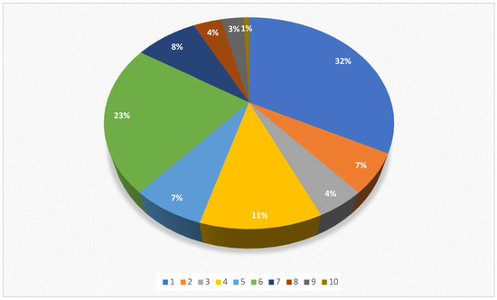 Pie chart showing the distribution of the 132 citations included in a scoping review, categorized according to the target organ/structure (1: ovaries 32%, 2: uterus 7%, 3: ovaries-uterus 4%, 4: urinary bladder 11%, 5: inguinal rings 7%, 6: testes 23%, 7: general information about laparoscopy 8%, 8: kidney 4%, 9: uterine tubes 3%, and 10: ductus deferens 1%).