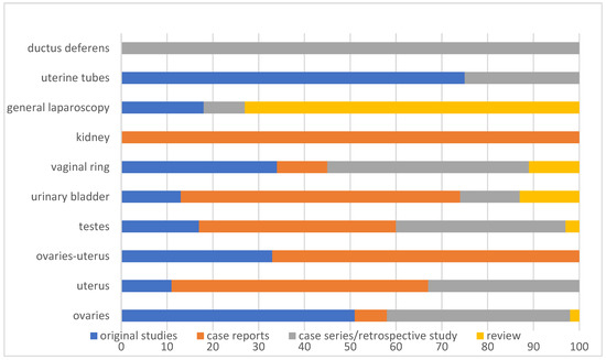 When the target organ was considered, the identified research focused mainly on ovaries (42/132) and testes (30/132), followed by urinary bladder (15/132), general information about laparoscopic surgery (11/132), inguinal rings (9/132), uterus (9/132), ovaries- uterus (6/132), kidney (5/132), uterine tubes (4/132), and ductus deferens (1/132) (Figure 3).