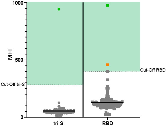 Serological evaluation of antiSARS-CoV-2 antibodies in pet rabbits in France. The green dots represent the rabbit positive for both antigens, whereas the orange dot represents the rabbit positive for RBD antigen only. The solid black line indicates the average fluorescent intensity. The same population was used to determine the cutoff for positivity (mean + 3× standard deviation).