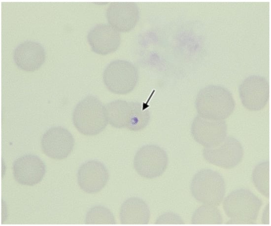 Stained blood smear showing a merozoite (arrow) within an erythrocyte in a domestic cat in central Italy. May–Grunwald–Giemsa stain, magnification of 100×.