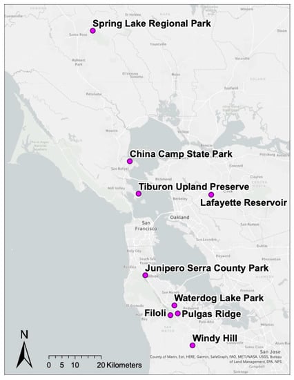 - Salkeld, D.J.; Leonhard, S.; Girard, Y.A.; Hahn, N.; Mun, J.; Padgett, K.A.; Lane, R.S. Identifying the reservoir hosts of the Lyme disease spirochete Borrelia burgdorferi in California: The role of the western gray squirrel (Sciurus griseus). Am. J. Trop. Med. Hyg. 2008, 79, 535–540. [Google Scholar] [CrossRef]