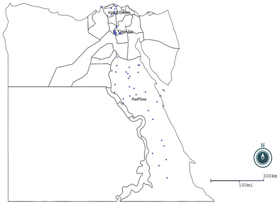 A cross-sectional study was conducted during 2020 in three governorates of Egypt that had high camel populations. The study areas were the governorates of: Qalyubia (30°25 N to 31°13 E), Kafr ElSheikh (31.1107° N, 30.9388° E) and the Red Sea (25°32′1″ N 33°26′18″ E) (Figure 1). The climatic conditions of Qalyubia and Kafr ElSheikh governorates are wet winters with moderate rainfall and dry summers, while the Red Sea area has a desert climate during the whole year with virtually no rainfall. These warm climatic conditions are suitable for tick propagation. Ticks are the principal vector for transmission of Anaplasma spp. Moreover, the types of observed ticks in examined camels in the study areas were mainly Rhipicephalus annulatus, Hyalomma dromedarii and Rhipicephalus turanicus [17].