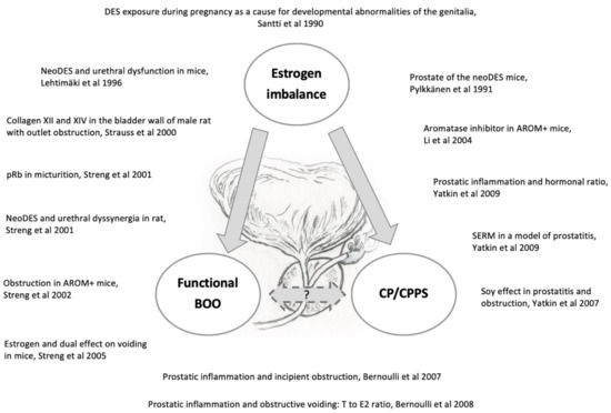 Imbalanced estrogen action causes both structural (e.g., prostatic inflammation) and functional (e.g., bladder outlet obstruction) dysfunction in the lower urinary tract as depicted in our several preclinical rodent studies [57,60,72,73,74,75,76,77,78,79,80,81,82,83].
