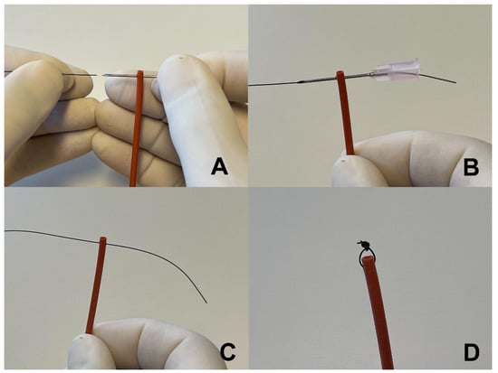 Construction of a temporary stent: (A) A hypodermic needle is inserted through the distal end of the stent and a suture is inserted into the end of the needle. (B) The suture is passed all the way through the hypodermic needle until it exits the needle’s hub. (C) The needle is retracted, leaving the suture in the needle’s track. (D) The suture is tied to create a small loop at the distal end of the stent.