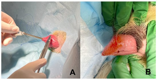 Placing a suture to anchor the temporary stent inside the urethral lumen of a male dog. (A) A groove director is inserted in the urethral lumen to assist direction of the needle and suture through the ventral wall of the penis, into the urethral lumen and out the external urethral orifice. (B) Completed suture after it was attached to the anchoring loop on the temporary stent, passed back into the urethral lumen and out of the ventral wall of the penis, and tied.