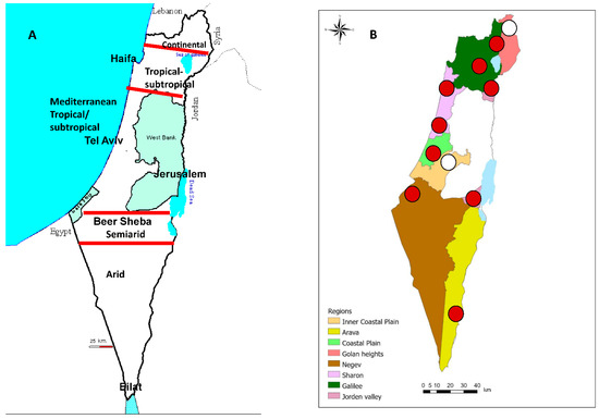 Map of Israel. (A). Israeli different climate zones, (B). Locations and types of farms sampled in this study. In white: farms that were thought to be “Negative controls” because they reported no clinical signs attributed to arboviral diseases until 2015. In red: all other farms.