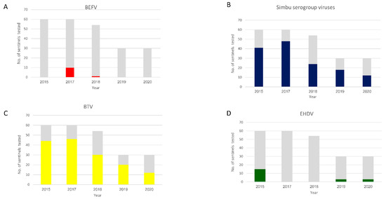 Seroprevalence of the arboviruses studied in sentinel cattle. BEFV (A), Simbu serogroup viruses (B), BTV (C), EHDV (D). The grey bars indicate the total of sentinels tested. The colored bars represent seropositive sentinels.