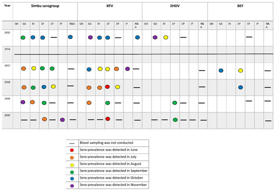 - BTV—In total, 152 out of 234 sentinels seroconverted against BTV during this study. Forty-four in 2015; 46 in 2017; 30 in 2018; 20 in 2019 and 12 in 2020 (Figure 2C and Figure 3). Seroconversion mostly accrued during the hot months (Figure 3). Seroconversion occurred in all the farms examined except for the farms located at the Golan Heights and the Judea Mountains during 2015, 2018–2020. In 2017, seroconversion occurred in all the farms examined, including a single animal from the farm in the Judea Mountains. The farm in the Golan Heights remained “naïve” throughout the study (Figure 3).