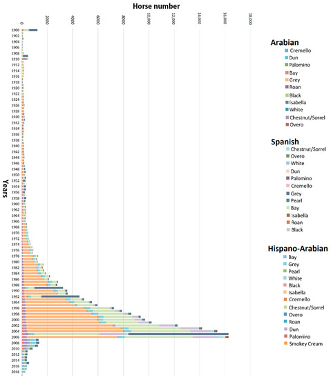 The historic pedigree records of Há, PRE and PRá breeds were considered in this study comprising a database consisting of 207,100 horses. A full description of the sexes and coats distribution in the historic and current datasets is presented in Table 1 and Figure 1 and Figure 2. Table S1 presents a summary chart of the genetic background of coat colour phenotypes described in PRE, PRá and Há horse breeds to date. Genetic analysis was conducted on the historical dataset comprising all animals (dead and living) and on a filtered dataset containing only living animals to evaluate the evolution and trends described by diversity and population structure parameters. ENDOG (v4.8) software [29] was used for all the analyses except for the analysis of ancestral contributions and probabilities of gene origin which were performed using CFC version 1.0 [30].