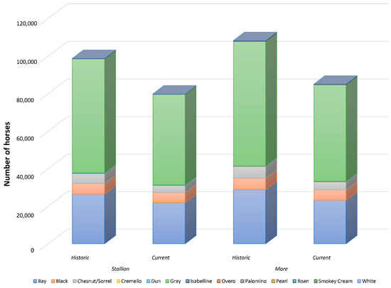 Percentages of offspring selected for breeding from mares were on average 10% higher than those for offspring selected for breeding from stallions. As suggested by Table S2, all percentages for offspring from stallion selected for breeding have slightly (grey, chestnut/sorrel, black, isabelline, cremello and roan) or moderately (white and pearl) decreased or maintained (dun) in the current population, except for the offspring selected for breeding from stallions presenting a bay coat colour. All percentages of offspring from mare selected for breeding slightly decreased in the current population of all coat colour subgroups, except for palomino coated mares for whom percentages were historically maintained.