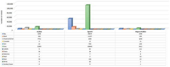 Coat colour subgroups sample size distribution across breeds (Spanish and Arabian Purebred and Hispano-Arabian horse breeds). Colours listed in table legend from top to bottom are presented in graphic from left to right.