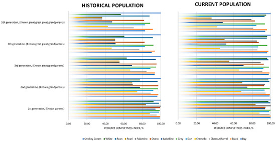 The number of complete generations [48] was around half the number of equivalent generations, which suggests that even if the genealogical information of individuals has progressively increased throughout the years, incomplete and partially incomplete pedigrees are still representative in the population. However, the presence of partially incomplete pedigrees may be unequally distributed across coat colour subgroups. For instance, as reported in Figure 4, coat colour subgroups such as grey, bay, black, overo and roan maintain pedigree completeness levels of over 80% at the fifth generation. Chestnut/sorrel subgroup have pedigree completeness levels of around 70% at the fifth generation. While cremello, isabelline and white coat colour subgroups presented pedigree completeness levels ranging from around 40 to 60% at the fifth generation, the lowest pedigree completeness levels were reported by palomino and pearl coat colour subgroups, with completeness levels of slightly over 35% at the fifth generation.