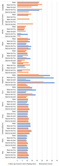 Generation intervals [32], and the mean age of parents when their offspring were born were calculated for the four gametic pathways (stallion to colt and filly and mare to colt and filly) across coat colour possibilities. The stallion/mare ratio was calculated considering the percentage of mares and stallions with breeding progeny and the number of breeding animals selected.
