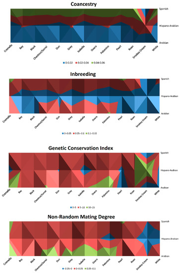 Distribution of nonrandom mating degree (α), inbreeding rate (F), coancestry (C) and Genetic Conservation Index (GCI) across coat colour subgroups for the Arabian and Spanish Purebred and Hispano-Arabian horses. The graphic should be interpreted as a bird’s-eye view.