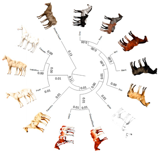 Distance-based tree construction algorithms are supported on the calculation of genetic distances, as in [43] FST or Nei’s [44]. In particular, Nei’s genetic distance were used to construct the trees in this study given they represent “raw distances” among subgroups. The use of FST or Nei’s may lead to a similar interpretation. In these regards, when comparing breeds of the same species, FST values are always expected to be below 0.05, as this may be the lower limit for species differentiation. However, when breeds are connected (PRE and PRá are the parental breeds of Há) the values slightly increase over 0.05 [45]. Nei’s minimum genetic distances [44] among all the coat colour subgroups were computed. Dendrograms were constructed using the construct Unweighted Pair-Group Method using Arithmetic averages (UPGMA) Tree task from the Phylogeny procedure of MEGA X 10.0.5.