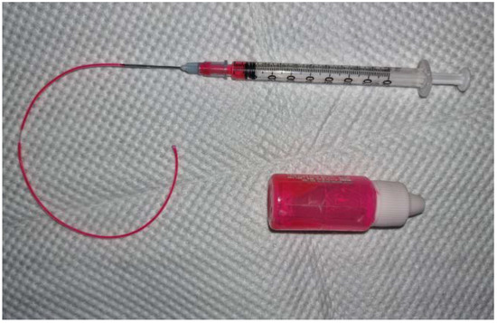 For general anesthesia, 0.04 mg/kg of medetomidine hydrochloride (Domitor®, Zoetis, Espoo, Finland) was injected intravenously, and 5 mg/kg of ketamine hydrochloride (Yuhan, Seoul, Korea) was injected intramuscularly. A customized instrument was developed with a 1 mL syringe and a PTFE Teflon tube with 0.5 mm inner diameter and 0.9 mm outer diameter (Uxcell, Hong Kong, China) (Figure 1). Waterproof tattoo ink (Tana Lee Temporary Coloring Tattoo Ink, Oyecoskorea, Incheon, Korea) was used. Using a video otoscope (Karl Storz Veterinary Endoscopy America, Goleta, CA, USA), an ink droplet was placed on the posterior quadrant of the pars tensa (PT). The day the ink drop settled on the TM was considered Day 0. The TM was re-evaluated by filming with the AIDA-vet video capture system (Karl Storz Veterinary Endoscopy America, Goleta, USA). Images showing the width of the malleus and the whole PT were captured. Ink drops were evaluated on Days 3 ± 1, 7 ± 1, and 14 ± 1, until either day 21 ± 1 or until the ink deviated from the PT. The image from day 0 was visualized on a laptop computer screen during re-evaluation [6]. Each beagle TM was divided into a control group or a treatment group. No substance was applied to the control group, while the treatment group had 0.05 mL of cAD-MSCCM applied directly on the TM every week using video otoscopy.