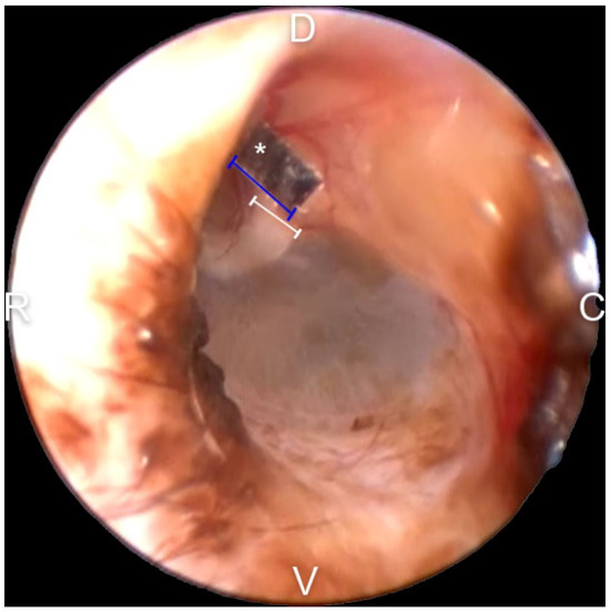 Malleus width measurement with 1.5 × 1.5 mm2 tailored 3M tape as a referential scale. The referential scale was placed near the short process of the malleus. Then, using Adobe Photoshop, the width of the scale and the short process of the malleus were measured in pixels. Then, using the ratio, the actual size was measured indirectly: asterisk—referential scale; blue line—width of the referential scale; white line—width of the malleus; D—dorsal; V—ventral; C—caudal; and R—rostral.