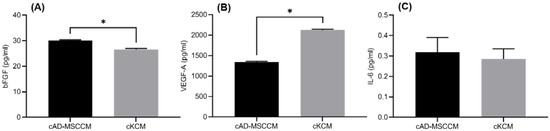 Comparison of basic fibroblast growth factor (bFGF): (A), vascular endothelial growth factor-A (VEGF-A) (B), and interleukin-6 (IL-6) (C), concentrations between canine adipose tissue-derived mesenchymal stem-cell-conditioned media (cAD-MSCCM) and canine keratinocyte-conditioned media (cKCM) (*: p < 0.05).