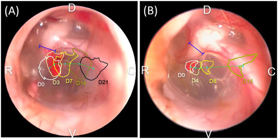 Gross comparison of the tympanic membrane (TM) epithelial migration (EM) rate in the control group (A) and treatment group (B). The ink drop path over time in the treatment group is visualized in progressively darker colors. The ink drop deviated faster in the treatment group than in the control group and hence had a shorter evaluation period: blue line—width of the malleus; cyan line—midpoint of the ink drops; green line—migrated distance between the two chronological time intervals; D—dorsal; V—ventral; C—caudal; and R—rostral.