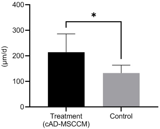 In this in vivo study, the weekly application of cAD-MSCCM improved the TM EM rate without adverse effects. As shown in Figure 5 and Table 2, the mean ± S.D. for the TM EM rates were 212.5 ± 66.4 μm/d and 133.1 ± 30.9 μm/d for the treatment and control groups, respectively. According to Tabacca et al. [6], the normal PT TM EM rate in dogs is 96.4 ± 43.1 μm/d; this finding is similar to or slower than the rate in the control group in this study. This might be due to aging, which slows down the TM EM rate [7]; some dogs in the Tabacca study were older than the ones involved in this study. In this study, the TM EM rate of the treatment group was clearly faster than in that in the Tabacca study. There was no significant difference between the TM EM of both ears. This was observed in both the treatment and control groups. The mean ± S.D. for the width of the mallei was 1022 ± 142.2 μm for two-year-old beagles. Tabacca’s study found that the average mallei width measured with a handheld caliper was 1.0 mm [6]. The width of the malleus is an essential indicator that allows TM EM measurement utilizing otoscopes. Unlike previous studies, the measurement method used in this study showed reliability without euthanasia, hence avoiding the need for animal sacrifice.