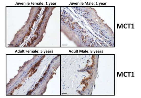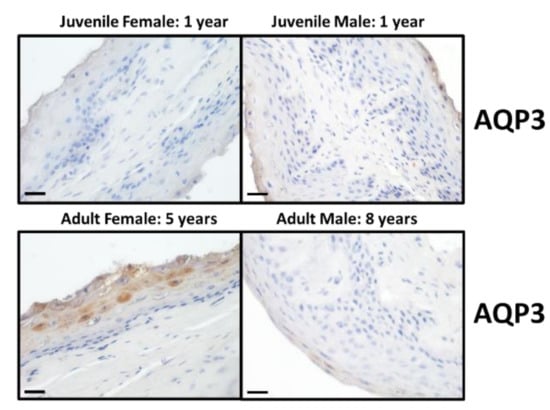 For each of the four different animal categories, immunolocalisation studies were performed to investigate the presence and localisation of UT-B2, AQP3 and MCT1 transporter proteins. Firstly, the UT-Bc19 antibody produced strong staining, predominantly located in the cells of the stratum basale epithelial layer (Figure 2). Interestingly, the level of staining appeared to differ with sex—namely, females had greater UT-B staining than males (Figure 2). In comparison, very little staining was obtained with the AQP3 antibody, with only some stratum corneum and stratum granulosum staining identified in the adult female tissue (Figure 3). Lastly, MCT1 transporters appeared to be strongly detected throughout the stratum basale layer of all animals (Figure 4).