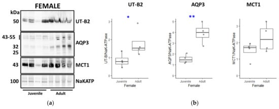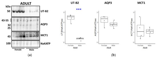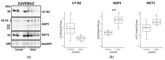 In the next set of experiments, transporter abundance was compared between female and male juveniles (Figure 8A). While AQP3 was significantly increased in male juveniles (p < 0.01, n = 4, ANOVA), there were no differences in either UT-B2 or MCT1 abundance (both NS, n = 4, ANOVA) (Figure 8B). Finally, a last set of comparisons was performed between tissues from female and male adults (Figure 9A). Although there were no changes in either AQP3 or MCT1 (both NS, n = 4, ANOVA), there was a very significant increase in UT-B2 in adult females compared to adult males (p < 0.001, n = 4, ANOVA) (Figure 9B).
