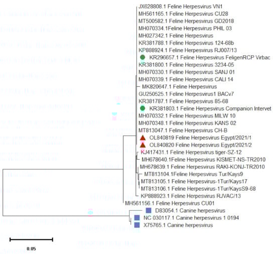 Alignment and Phylogenetic analysis of the nucleotide sequence of the TK gene amplicon of the two isolates (FHV1Egypt/2021/1) and (FHV1Egypt/2021/2) revealed 99–100% sequence identity to most of FHV-1viruses isolated worldwide (Table 2). Our isolates showed 100% sequence homology with FHV-1 isolates FHV 1 KANS_02, FHV 1 PHIL_03, FHV 1 BACv7, FHV 1 VN1 and FHV 1 CH-B (GenBank accession numbers MH070348.1, MH070334.1, GU250525.1, JX628808.1 and MT813047.1) respectively. In addition, as shown in Figure 3, these isolates also showed 100% identity to the vaccinal strains FeligenRCP Virbac (KR296657.1) and Companion Intervet (KR381803.1).