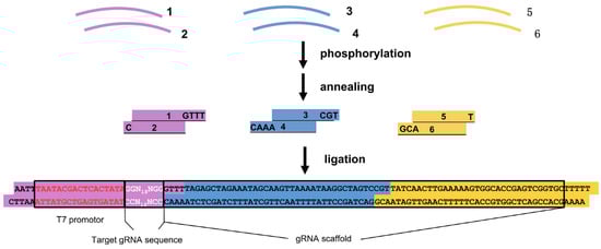 Cas9 is the most common endonuclease used to cut target DNA during gene editing. After it forms a ribonucleoprotein with gRNA, it performs a double-stranded cut at the protospacer adjacent motif (PAM), causing a double-stranded break, and thus enabling gene editing []. CRISPR-Cas9 can be programmed to target multiple genes at once, which has been demonstrated in a variety of species [,,]. Previous methods used plasmid-based cloning vectors to generate gRNA templates []. However, these methods are time-consuming because multiple cloning manipulations are required. The sequence of gRNA we used, as previously described [], differs from other gRNAs used [] in that our gRNA contains additional tracrRNA-derived sequences at the 3′ end. In our method, the gRNA template was generated by six oligonucleotides (38–46 nt) that were annealed and ligated in one step (Figure 1). The overhangs of the annealed oligonucleotides were carefully designed to ensure the precise order of ligation and to suppress circulation of the ligation products. With this method, we could routinely generate multiple gRNA templates within 4 h. Then, in vitro transcription was used to generate gRNA.
