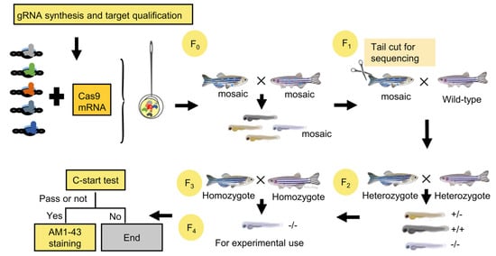- Varshney, G.K.; Pei, W.; LaFave, M.C.; Idol, J.; Xu, L.; Gallardo, V.; Carrington, B.; Bishop, K.; Jones, M.; Li, M.; et al. High-throughput gene targeting and phenotyping in zebrafish using CRISPR/Cas9. Genome. Res. 2015, 25, 1030–1042. [Google Scholar] [CrossRef] [Green Version]