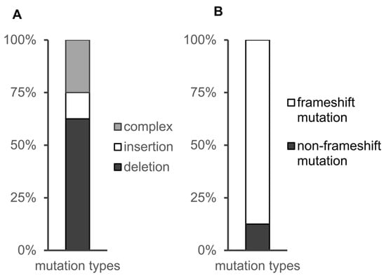 The mutations were classified into different types. (A) Comparison of the types of mutations. The mutations were classified in three different groups: deletions, insertions, and complex (at least one deletion and at least one insertion). (B) Comparison of the types of mutations detected by sequencing. The mutations were classified in two different groups: frameshift mutation(change the reading frame) and non-frameshift mutation.