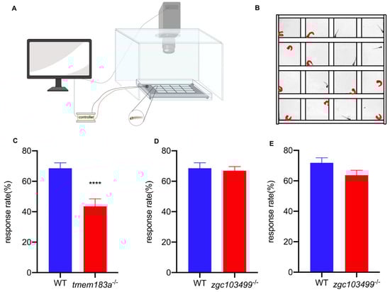 C-start response in tmem183a- and zgc103499-deficient zebrafish larva: (A) a diagram of the C-start experimental apparatus. A transparent plastic plate was placed on top of a light screen, which was vibrated by an oscillator. Each well was filled with 150 µL embryo medium and one zebrafish larva. The responses of 16 zebrafish were recorded in one session; (B) the representative frame of the C-start response in zebrafish; (C) the mean response rate of tmem183a-deficient zebrafish at 5 dpf. N(wild-type) = 48, N(tmem183a-/-) = 48, ****: p < 0.0001; (D) the mean response rate of zgc103499-/- zebrafish at 5 dpf. N(wild-type) = 48, N(zgc103499-/-) = 48, ns; (E) the mean response rate in zgc103499-/-zebrafish at 8 dpf. N(wild-type) = 48, N(zgc103499-/-) = 48, ns.