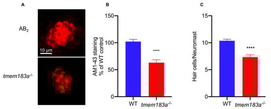 The tmem183a mutation impaired the hair cells of zebrafish: (A) confocal microscopic analysis of the hair cells in wild-type and tmem183a-KO zebrafish at 5 dpf; (B) quantification of the staining intensity of hair cell clusters at 5 dpf (for triplicate experiments). N(wild-type) = 32, N(tmem183a mutant) = 35, ****: p < 0.0001; (C) quantification of hair cell clusters at 5 dpf. N(wild-type) = 33, N(tmem183a mutant) = 38, ****: p < 0.0001.