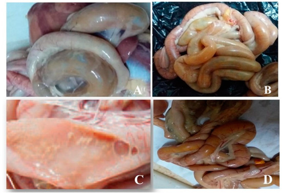 Examination of the intestine from chickens showed subclinical NE (Figure 1A,B). Multifocal pale foci of mucosal necrosis were observed from the serosa. The lumen of the intestine was filled with gas bubbles in the broiler. The intestine was filled with thick, brownish watery exudate in the jejunum (Figure 1C,D). Examination of the pigeon’s intestine exhibited no evidence of enteritis.