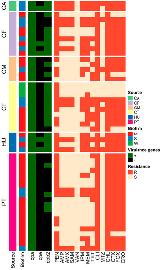 Data were introduced into R software (R Core Team, 2019; version 3.5.3) for data visualization. The R package “Complex-Heatmap” was used to build a heatmap based on virulence genes, biofilm category, and antimicrobials tested in isolates from chicken, pigeon, camel, and human consumers [33].