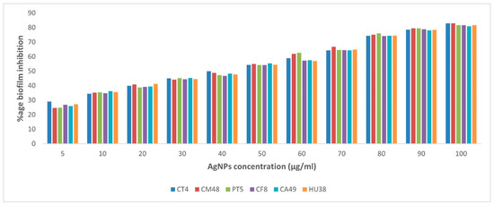 The use of NPs in inhibiting biofilms has been previously documented for various bacteria [79,80,81]. This study indicated the potential of AgNPs to inhibit biofilm production at concentrations of 75 and 100 µg/mL, and the percentage of inhibition was 80.8–82.8% at the highest AgNP concentrations. The inhibitory effect of AgNPs was previously reported by Siddique, Aslam [81] on biofilm production by Klebsiella pneumoniae isolates. The results revealed 23–86% inhibition in the presence of different concentrations of AgNPs due to the disruption of the EPS matrix. Moreover, other studies reported 89% and 75% biofilm inhibition in Staphylococcus aureus and Escherichia coli, respectively [82]. Studies also demonstrated that nanosized silver (at the size of 100 nM) resulted in a 95% reduction in biofilm production by Pseudomonas aeruginosa due to the disruption of the EPS matrix [83].