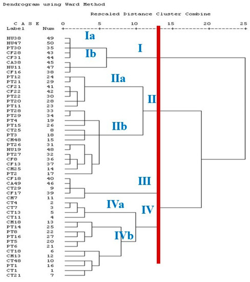 The RAPD-PCR patterns of the 50 C. perfringens isolates from different sources were investigated by a single amplification profile. The multiple DNA fragments ranged in size from 300 to 2700 bp. The primer sets manufactured 33 profiles (referred to as R1–R33). The discriminatory power of the RAPD-PCR was calculated using Simpson’s index of diversity, and the D-value was 0.9763, which indicated a high discriminatory power. The dendrogram analysis of the examined isolates (n = 50) showed four clusters (Figure 4). The similarity between the human, pigeon, and camel isolates in the same cluster was 100%.