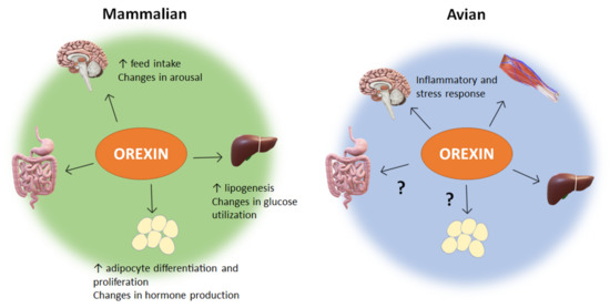 In avian hepatoma cells, orexin-A decreased the visfatin expression while orexin-B had no significant effect [85]. Additionally, both oxidative and heat stress were shown to alter the expression of orexin and its receptors in avian species, with oxidative stress appearing to modulate post-transcriptional mechanisms of orexin regulation [86]. These results provide a basis for orexin influencing the peripheral mechanisms of metabolism in avian species, specifically through regulating secretions and functions in the liver.