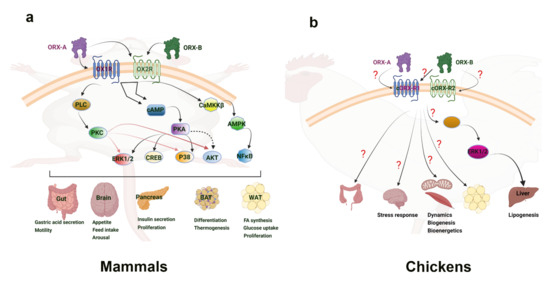 Orexin signaling pathways in mammalian (a) and avian species (b). “?” means that the downstream mediators are still not known or not well defined. Clear connections have been made to the link between orexin and the activation of energy sensing AMPK within the central nervous system of mammals. This provides a basis for connecting feeding behavior with orexin. Additionally, the ERK1/2 and Akt signaling pathways have been seen in hepatic response to orexin, inducing diverse cellular responses. While the main mechanism of action has yet to be determined, adipose tissue is shown to increase cytokines and other factors in response to orexin. In avian species, the ERK1/2 pathway has also been implicated in the liver response to orexin. Several mitochondrial related genes were shown to respond to orexin in avian muscle, but the direct mechanism of impact has yet to be elucidated. Culpable molecular signaling pathways have yet to be discovered in the avian central nervous system and adipose tissue response to orexin. AKT—Ak strain transforming kinase; AMPK—adenosine monophosphate-activated protein kinase; BAT—brown adipose tissue; CaMKKβ—Calcium/Calmodulin dependent protein kinase; cAMP—cyclic adenosine monophosphate; cORX-R1; chicken orexin receptor 1; cORX-R2—chicken orexin receptor 2; CREB—cAMP-response element binding protein; ERK1/2—extracellular-signal-regulated kinase 1/2; NFκB—nuclear factor kappa light chain enhancer of activated B cells; ORX-A—orexin-A; ORX-B—orexin-B; OXR1—orexin receptor 1; OXR2—orexin receptor 2; PKA—protein kinase A; PKC—protein kinase C; PLC—phospholipase C; P38—mitogen-associated protein kinase 38; WAT—white adipose tissue.