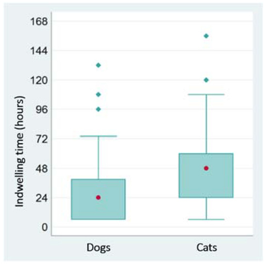 The median time of permanence in indwelling catheters was 25.5 h (minimum 6 h; maximum 156 h). In dogs, the median permanence time of devices was 24 h (minimum 6 h; maximum 132 h), whereas, in cats, it was 48 h (minimum 6 h; maximum 156 h) (p = 0.0021) (Figure 1).