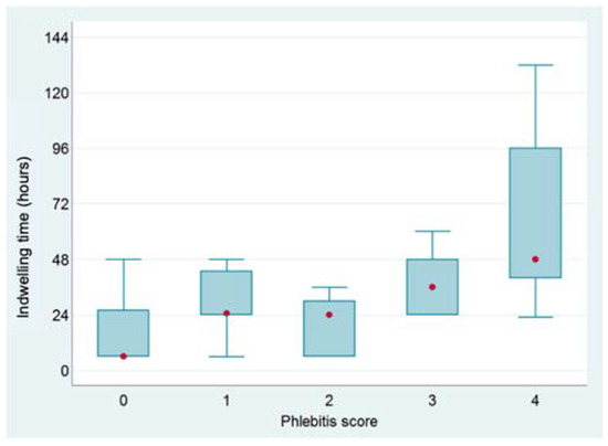 Every 12 h, the patients underwent a physical examination, and insertion sites were assessed for cleaning, patency, and functionality. Mechanical complications were defined as kinking, dislocation, occlusion of the device, and signs of infiltration or extravasation. The presence and extension of inflammation and early signs of phlebitis were evaluated using a Visual Infusion Phlebitis (VIP) grading scale from 0 to 5 [21]. Inflammatory complications were defined as the presence of pain, erythema, swelling, vein induration, or pyrexia identified by a VIP score of 2 or more [2,3]. When mechanical and inflammatory complications occurred simultaneously, they were classified as mixed.