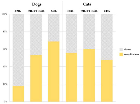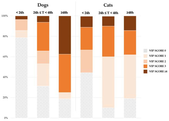In dogs, the indwelling time expanded across increasing values of VIP scores with a highly significant association (Wilcoxon: p < 0.001) (Figure 2). Additionally, using a different approach, the percentage of patients with a VIP score higher than a certain level (e.g., VIP score ≥3) increased as the duration of the device ranged between <24 h, at least 1 day but less than 48 h, and at least 48 h (Chi-squared: p < 0.0001) (Figure 3). On the contrary, no association between indwelling time and VIP score was found in cats. Similarly, the permanence of the device was positively related to the incidence of complications in dogs (Chi-squared: p = 0.0005). This association was not observed in cats (Figure 4).