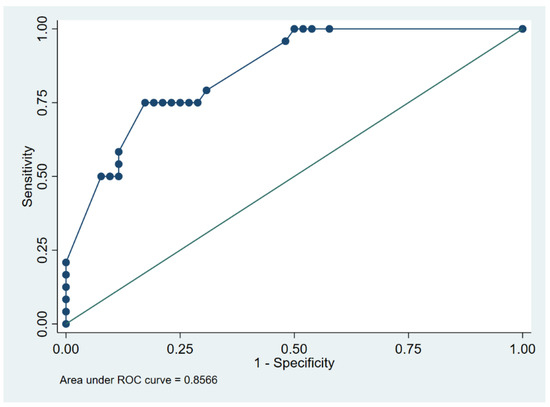 The multivariate analysis indicates that increased indwelling time in dogs (p < 0.001; R2 0.38; slope 0.039, 95% CI 0.028–0.051), the male sex in cats (p = 0.009; R2 0.31; slope 1.159, 95% CI 0.309–2.008), and the procedure conducted without sedation in cats (p = 0.001; R2 0.31; slope 1.459, 95% CI 0.609–2.308) correlated with increased values of the VIP score. In dogs, the ROC curve for the discrimination between absent–mild phlebitis (VIP score 0–2) and moderate–severe phlebitis (VIP score ≥ 3) showed an AUC of 0.86 (95% CI 0.77–0.94) (Figure 5) with 36 h identified as the optimal cut-off (Table 5).