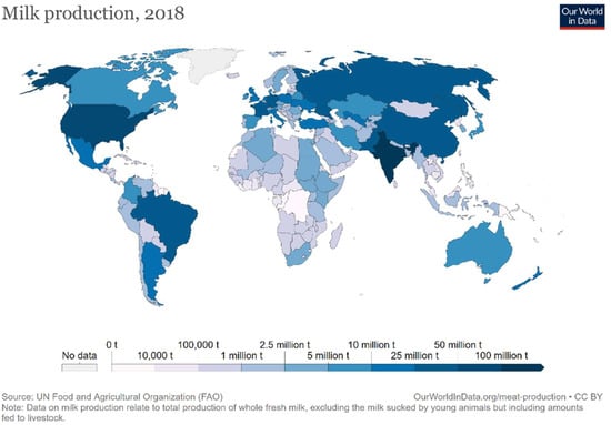 - UN Food and Agricultural Organization (FAO). Published Online at OurWorldInData.org. Available online: https://ourworldindata.org/grapher/milk-production-tonnes (accessed on 4 March 2022).