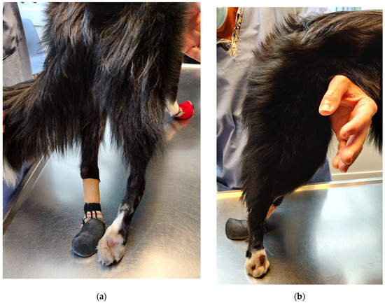 At the age of ten months, a new consultation was requested because of progressive neurological motor deficits and urinary/fecal incontinence. Despite a good improvement of the self-mutilation with oclacitinib administration, and the use of protective footwear to avoid injuries, the dog presented severe proprioceptive deficits of both hind limbs with spontaneous knuckling and hyperextension of the tarsal joints (Figure 2). Generalized muscle atrophy was observed and was more pronounced on the hind limbs. Due to the progressive neurological deficits and the poor prognosis, making the dog’s quality of life poor, the owner elected to euthanize the dog. Necropsy was declined by the owner.