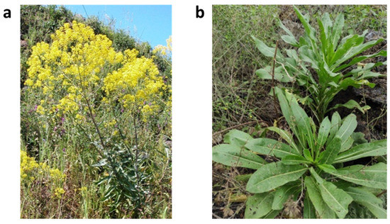 The plant material was collected from Isatis tinctoria L., a Sicilian autochthonous plant, growing spontaneously in the Acireale geographical area (Catania, Sicily, Italy). Basal leaves (It-BL) were picked in November, cauline leaves (It-CL) and flowers (It-F) were harvested in April. In panel Figure 1a, it is possible to see the entire plant in April along with flowers and cauline leaves. Basal leaves (November) are visible in Figure 1b. Cauline leaves are narrower than basal leaves, gradually thinner upwards and simple, entire, sagittate, usually amplexicaul, with acute auricles. The flowers are gathered in a racemose inflorescence, with yellow petals, tetradynamous androecium, consisting of six stamens with two filaments shorter than the others.