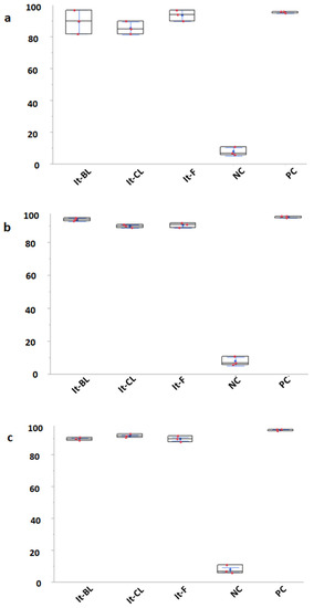 Figure 2 clearly shows the consistent reduction in larvae growth caused by the It-CL, It-BL and It-F dry extracts in comparison with the negative control group (NC). When the extracts were tested at the concentration of 1 mg/mL, it was recorded an inhibition of larvae growth equal to 95% for the positive control and of 89% for It-BL, 85% for It-CL and of 93% for It-F. When the extracts were diluted 1 to 1 to obtain the 0.5 mg/mL solution, the reduction in larvae development was recorded as 94% for It-BL, 90% for It-CL and 91% for It-F. When the concentration was reduced to 0.25 and 0.125 mg/mL, the inhibition of larvae growth persisted at levels close or above 90%. It was recorded equal to 84% only in case of It-BL extract used at a concentration of 0.125 mg/mL. Comparing the efficacy of each extract at all the mentioned concentrations against the NC group, the statistical test always yields p-values below 0.0001. All the aforementioned results are resumed in Figure 2. The performed measurements clearly demonstrate the efficacy of all the tested I. tinctoria extracts in consistently reducing the ewes’ helminths larvae growth. The positive control thiabendazole showed a growth inhibition percentage of 95%, which represents only 5% more than the efficacy of the tested extracts.