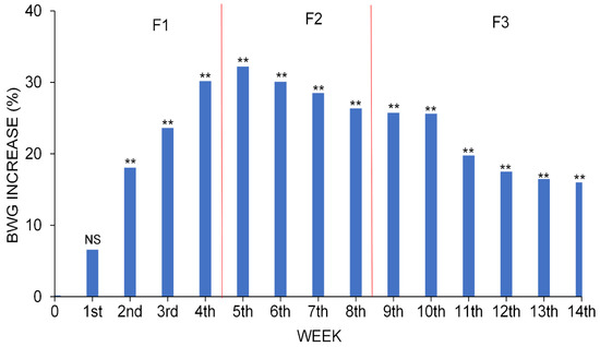 | BWG | 19.4 ± 0.5 | 13.1 ± 0.5 | ** | 60.2 ± 1.9 | 44.3 ± 2.1 | * | 66.0 ± 1.4 | 63.8 ± 1.2 | NS | 49.99 ± 0.78 | 43.8 ± 1.2 | ** |