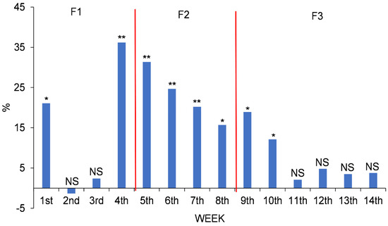 | Sig. | NS | NS | ** | ** | ** | NS | NS | NS | NS | * | NS | * | NS | * | NS | |
