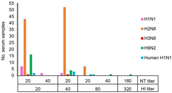 A hemagglutination inhibition (HI) assay was performed as a screening test for the detection of antibodies against 16 subtypes of the AIV virus, including H1-H16 virus and two strains of human H1N1 influenza virus comprising human H1 (104) virus and human H1 (NP-045) virus. All serum samples were treated with receptor destroying enzyme (RDE; Denka Seiken, Japan) at 37 °C for 16–18 h, followed by heat inactivation at 56 °C for 30 min and absorbing with 50% goose erythrocyte suspension at 4 °C for 1 h. The HI assay was carried out by the procedure described previously [15,16]. The test was performed twice and duplicate wells were run for screening dilution at 1:10 of individual serum samples. The treated serum control, red blood cells (RBCs) control, and back titration of the test virus were included in each run. Geometric mean titers (GMTs) of each virus subtype were calculated. The HI titers < 20 were assigned as 10, and the HI titers ≥ 320 were assigned as 320. The serum samples with HI titers ≥ 20 were further determined for neutralizing antibodies using a microneutralization (MN) assay.